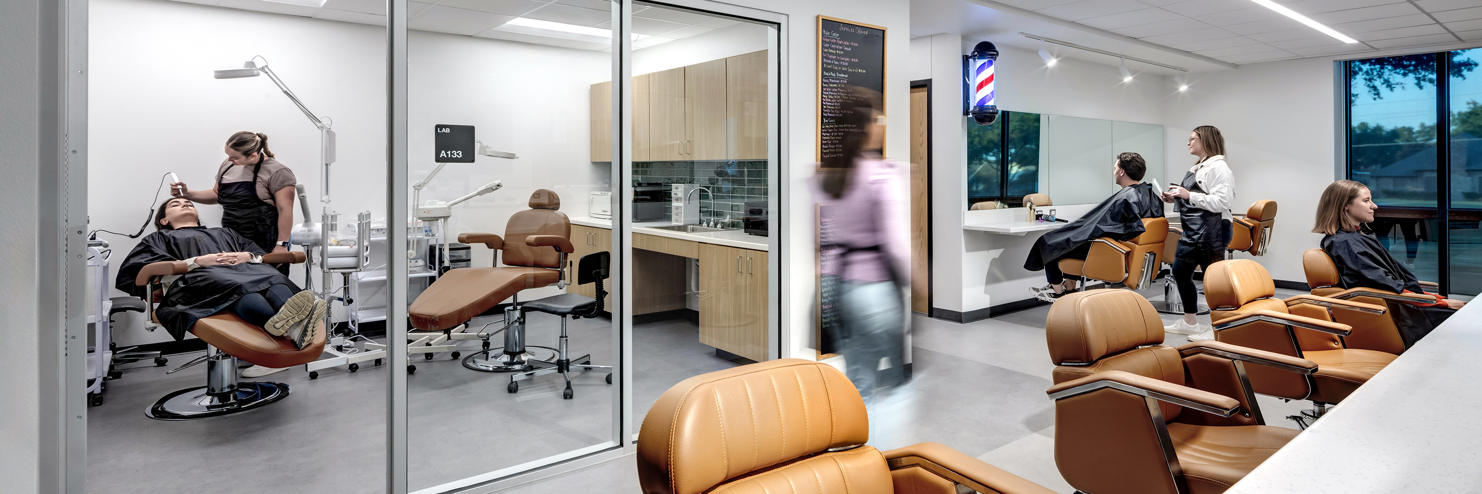 Each of the 32 cosmetology stations are equipped with professional barber chairs, custom millwork and mirrors, and outlets for multiple sets of equipment. The environment is designed and treated as a professional business that is currently open to the public for business. This space gives the students a place of unity and professionalism as it prepares them for a career in Cosmetology.