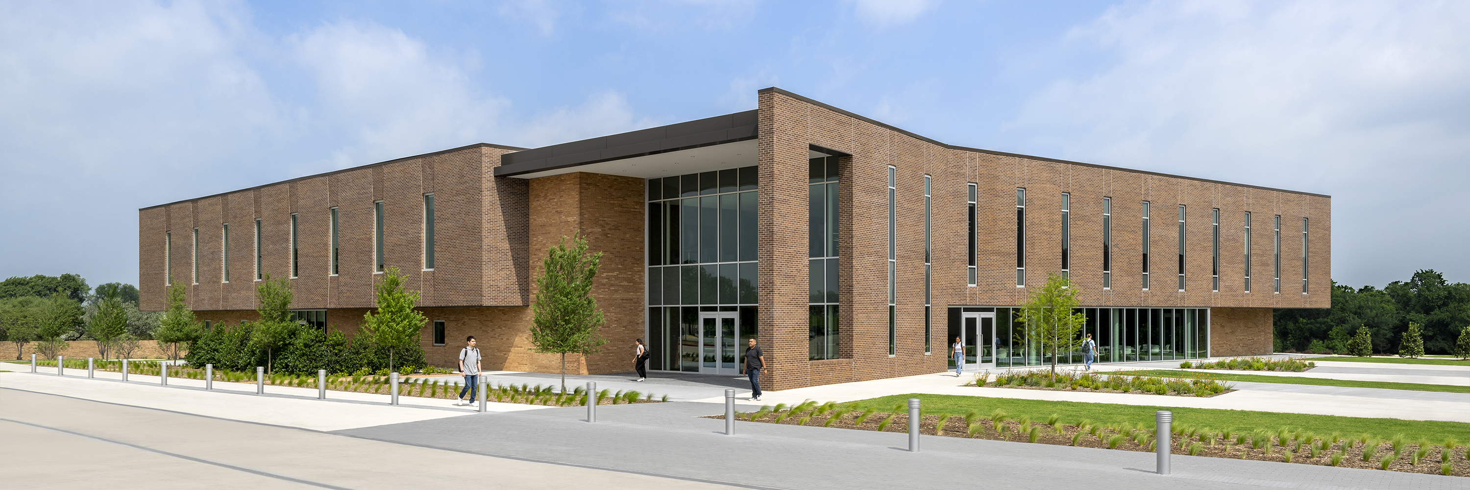 Glenn|Partners designed the ECC to act as a pathway to college by integrating and strengthening existing pedestrian pathways with the new ECC building. The ECC also serves as a haven for students visiting campus from multiple home districts and offers a place to meet with teachers, study, collaborate, and grab a bite to eat when not attending a college course on campus. As the pathways engage the ECC they become physical objects to shape outdoor seating, collaboration, dining, and classroom spaces shielded from sun and rain by native landscape and building canopies. The ECC consists of administrative spaces for each school district, future ready core classrooms designed for collaborative / flexible furniture systems, physics, biology, and chemistry labs, and a digital media lab. These spaces are all designed around a flexible and transparent multi-purpose space that serves as a hub for dining, collaborative group projects, rainy day physical education, and lectures. The ECC blends traditional campus materials of brick and glass with new materials like durable concrete walls that shape the outdoor spaces and metal window fins that allow the corridor and public spaces to be transparent and optimized for solar efficiency.
