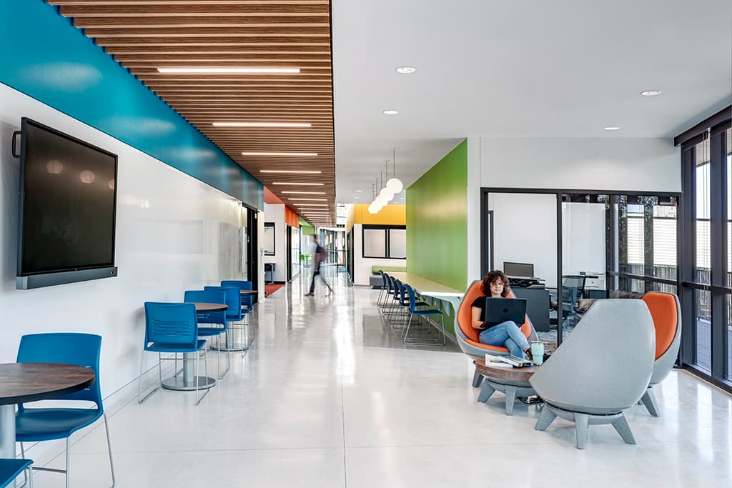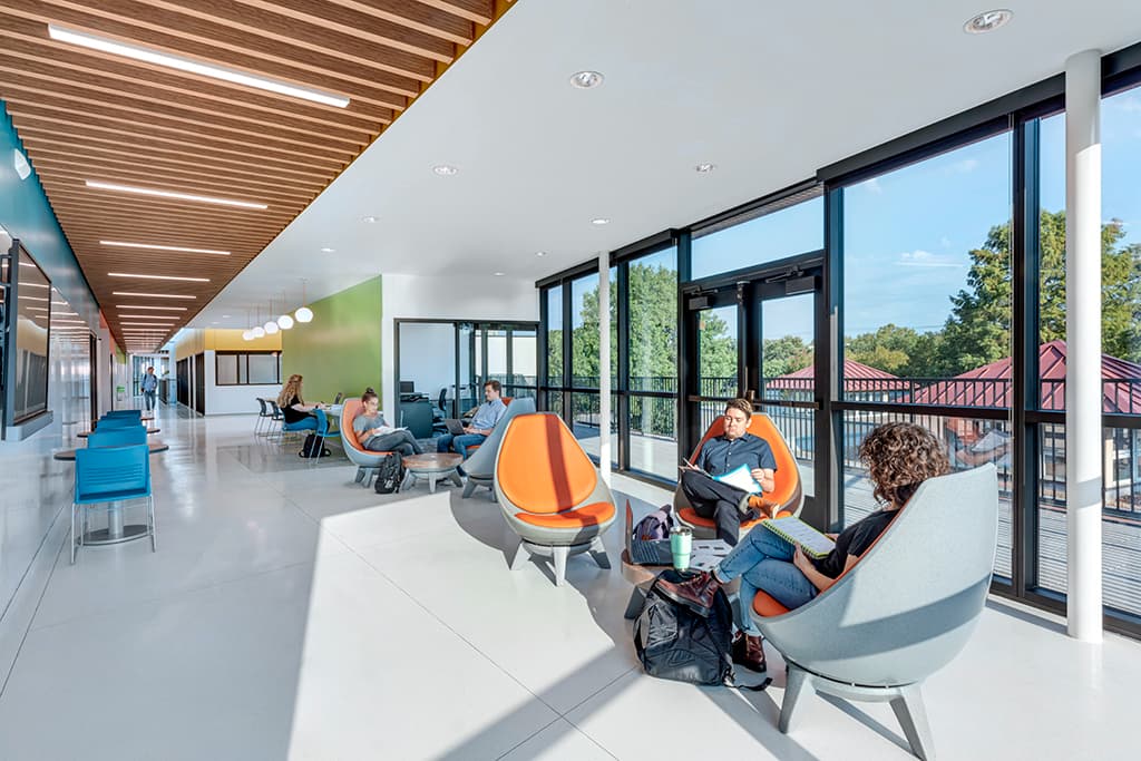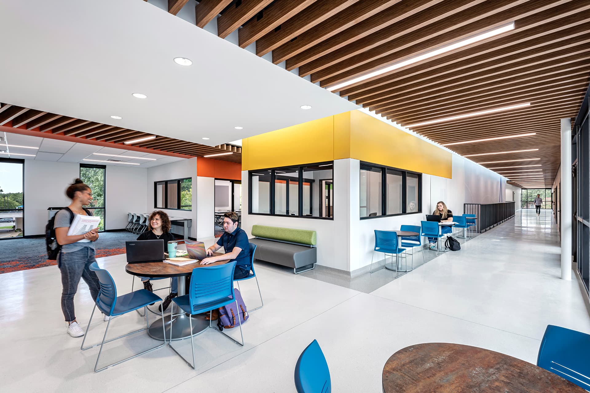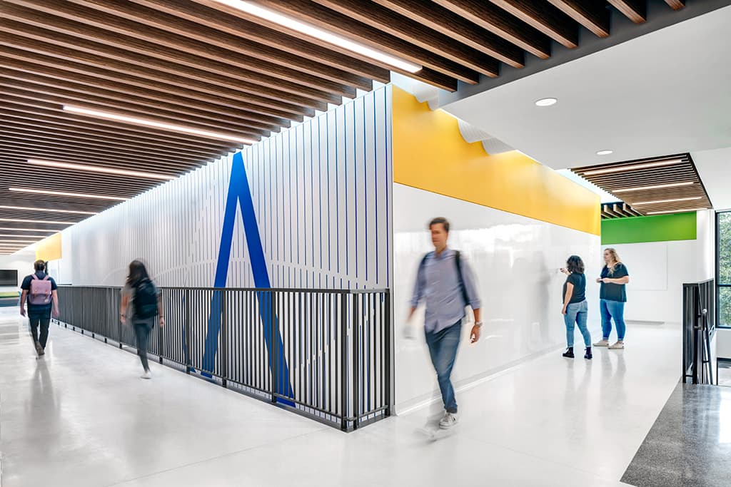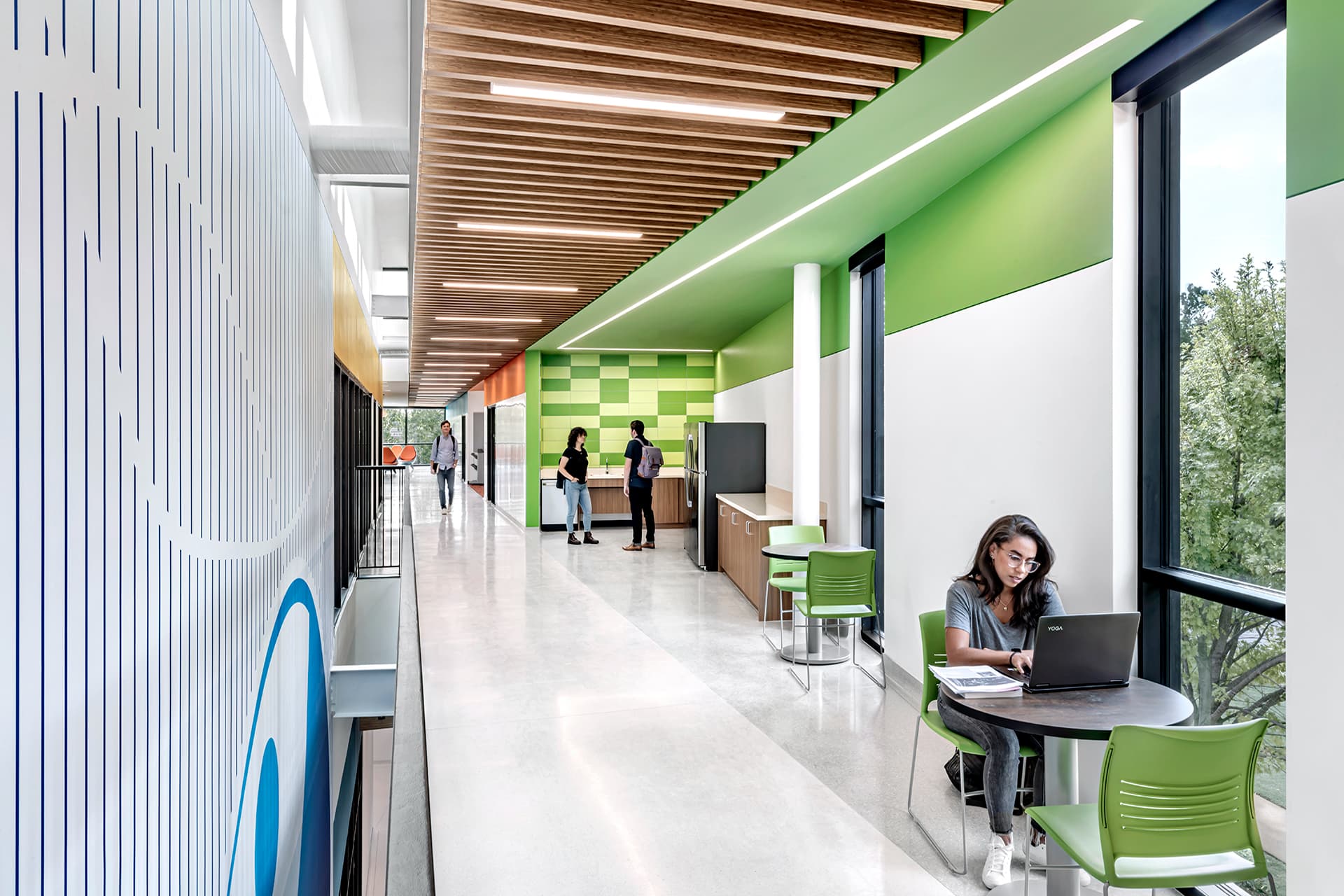 Academic spaces include nine flexible and collaborative classrooms paired with three state-of-the-art science labs dedicated to IB chemistry, biology, and physics. Open and unscheduled collaboration areas are interspersed throughout the building to encourage student interaction and group work. Additional next-generation learning environments feature a real-world design studio with full engineering and robotics (maker space) functionality, a digital film and broadcast studio, an instrumental music classroom, and a theater arts classroom.