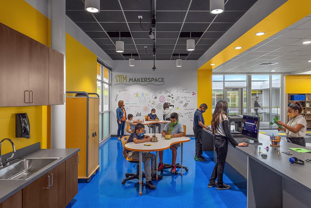 The school’s organization significantly improves site logistics with three clearly defined entries—a main entry for visitors, a secure after-hours entry for community events, and a dedicated faculty entry. Adjacent to the main entry, administrative spaces greet students with direct views into vibrant indoor and outdoor learning activities. Two primary community hubs—the multi-purpose gymnasium and cafeteria—anchor opposite ends of the building, accommodating gatherings, performances, and after-hours use. At the heart of the school, an outdoor learning courtyard connects to surrounding academic corridors as well as art, music, and cafeteria spaces on the ground-level. Overlooking the courtyard, the upper-level media center and maker space extend opportunities for interactive, hands-on learning.