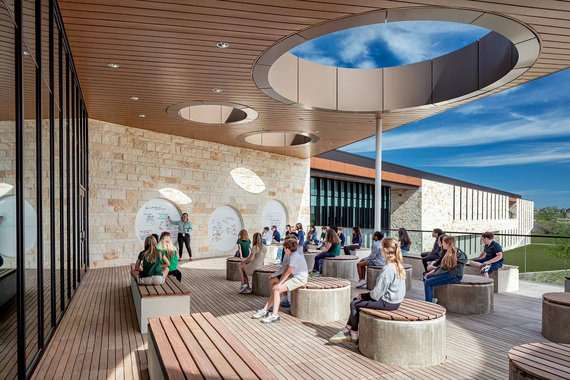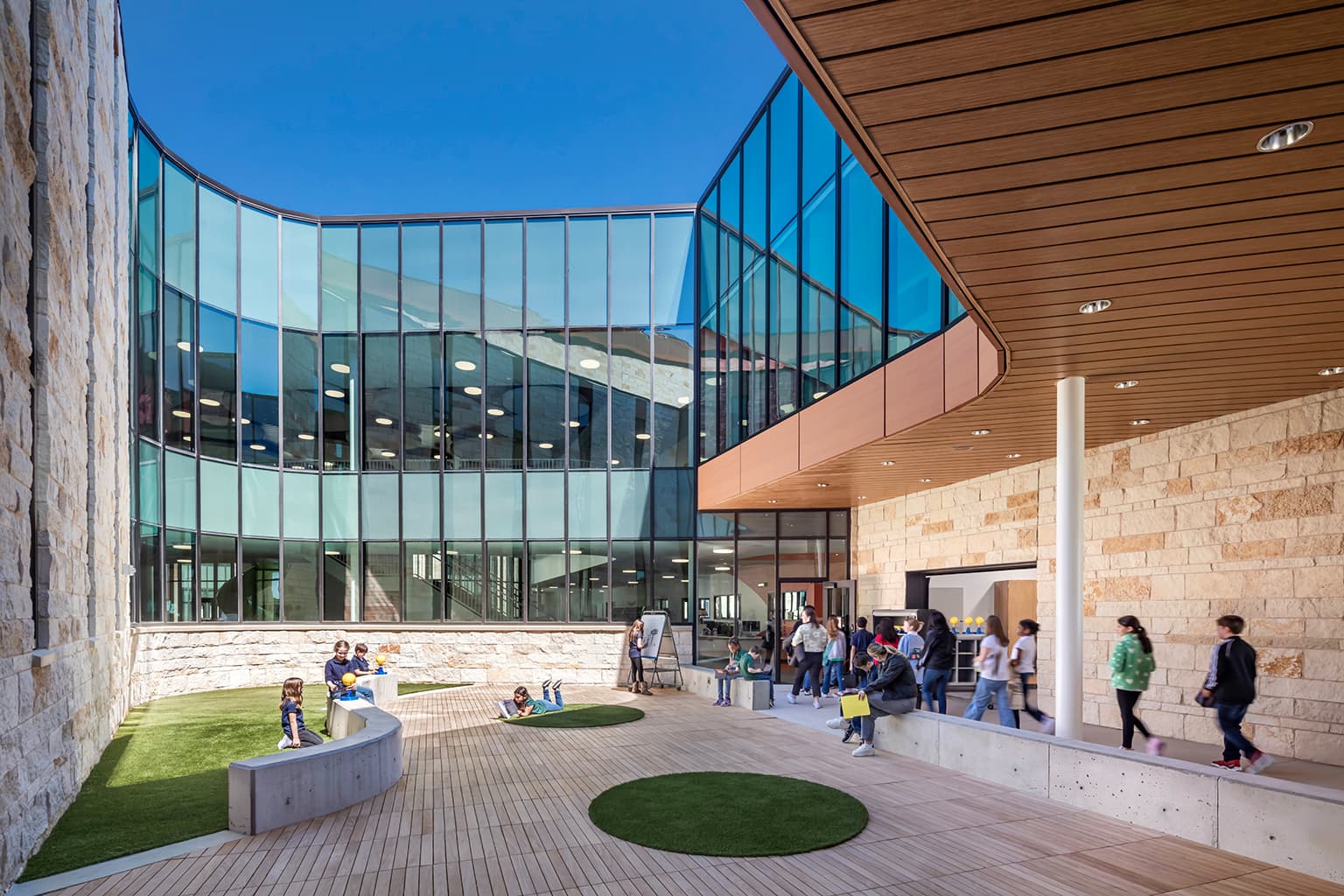From this central hub, Core Academic wings radiate outward, each interspersed with indoor and outdoor collaboration pods that foster student engagement, flexibility, and informal learning. Their splayed arrangement not only creates a dynamic learning environment but also shields outdoor play areas and learning pavilions at both the north and south edges of the campus, enhancing safety while reinforcing a seamless connection between indoor instruction and outdoor activity. This intentional organization reinforces clear wayfinding, maximizes use of the sloped site, and creates a cohesive campus experience that balances functionality, security, and a strong sense of place.