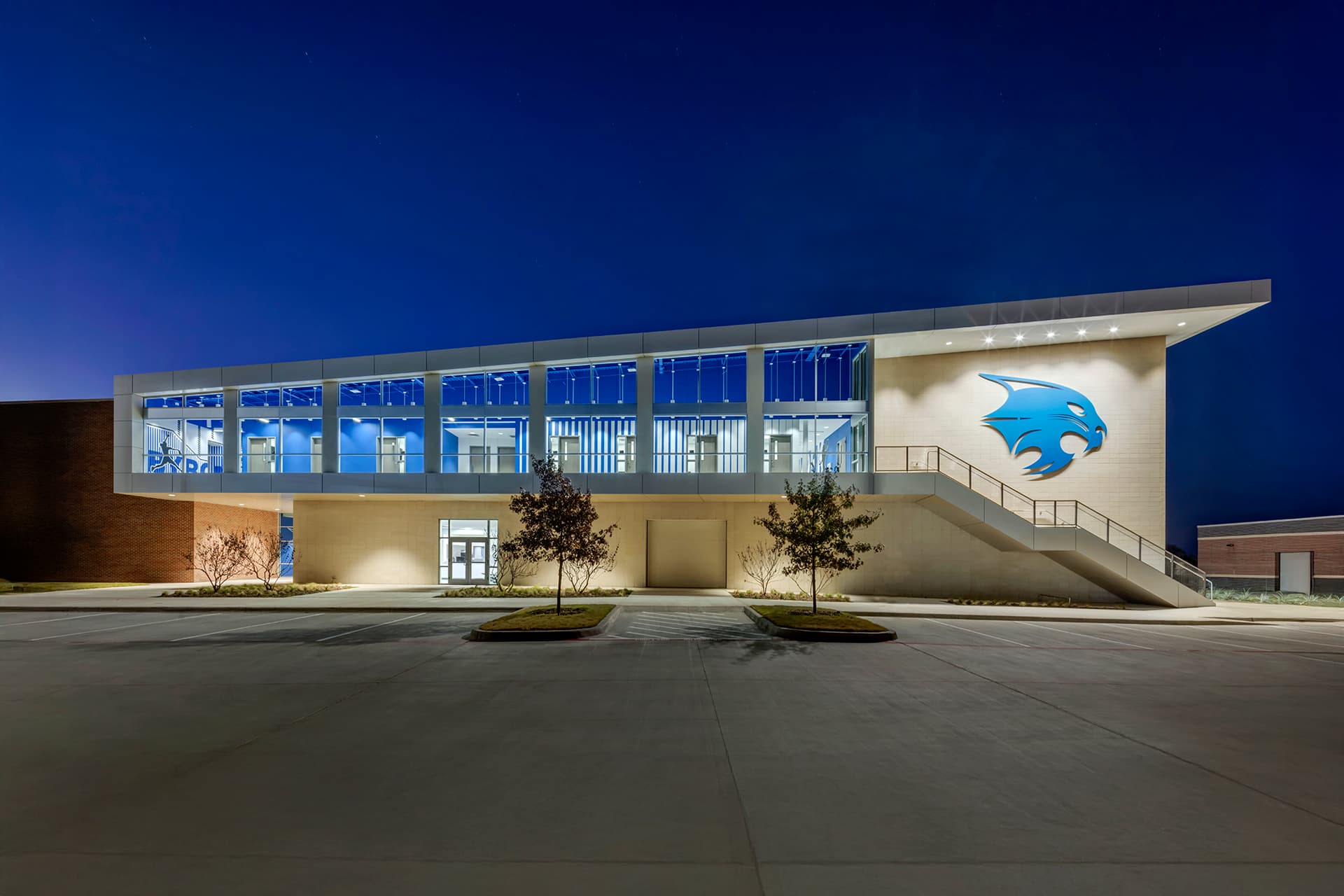 The new 42,000-square-foot Athletic Field House for Northwest ISD’s Byron Nelson High School transcends traditional thinking to deliver an innovative and creative design solution that supports athletic performance, wellness, and physical training. The design and planning of the facility are fully integrated into the landscape, reinforced by earth berms and sloping retaining walls that convey a sense of lift and motion within the architectural concept. Using accessible ramps and a variety of stairs, the building itself becomes an interactive training tool, allowing athletes to engage with the structure as part of their workouts.