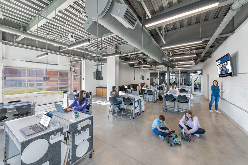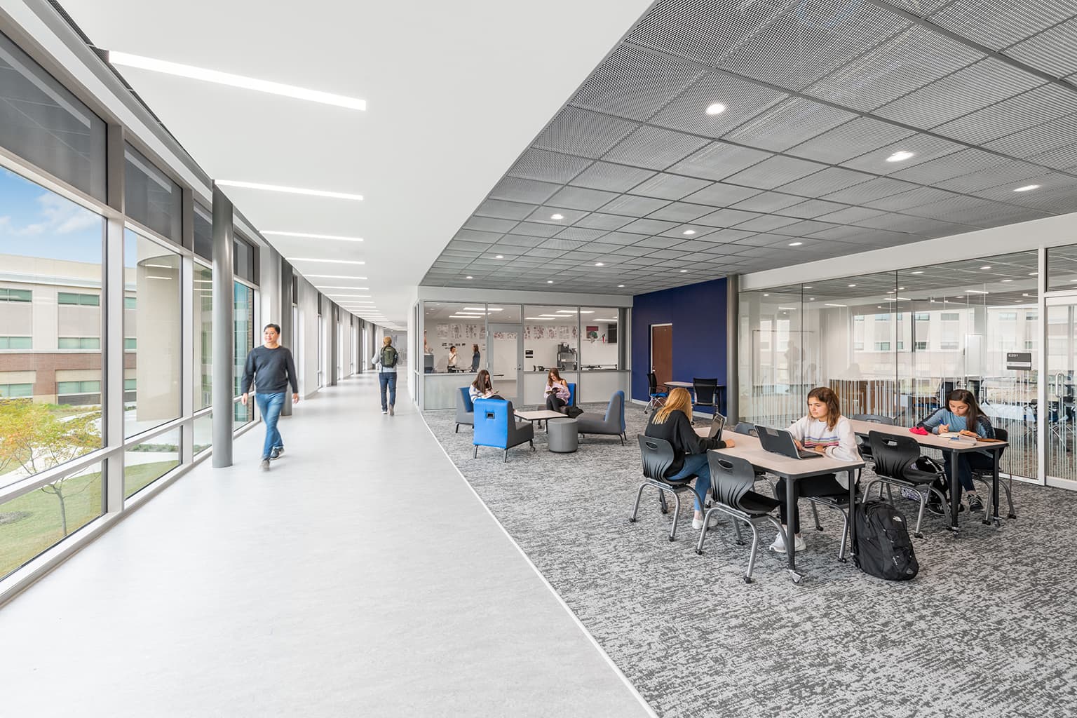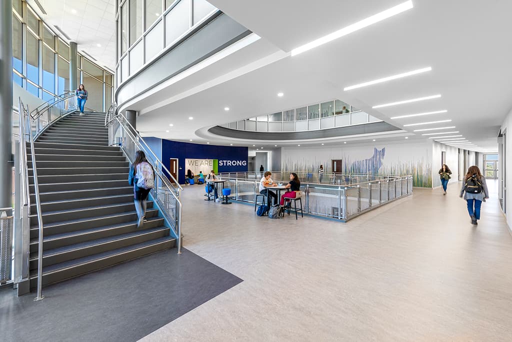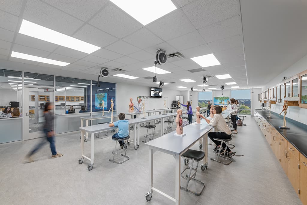 Upper levels house an expanded science program, including anatomy, biomedical (principles, innovation, and human body systems), health science, EMT, and six physics labs. Twelve core classrooms wrap around a central, light-filled atrium that promotes visibility, connection, and collaboration across all three levels.