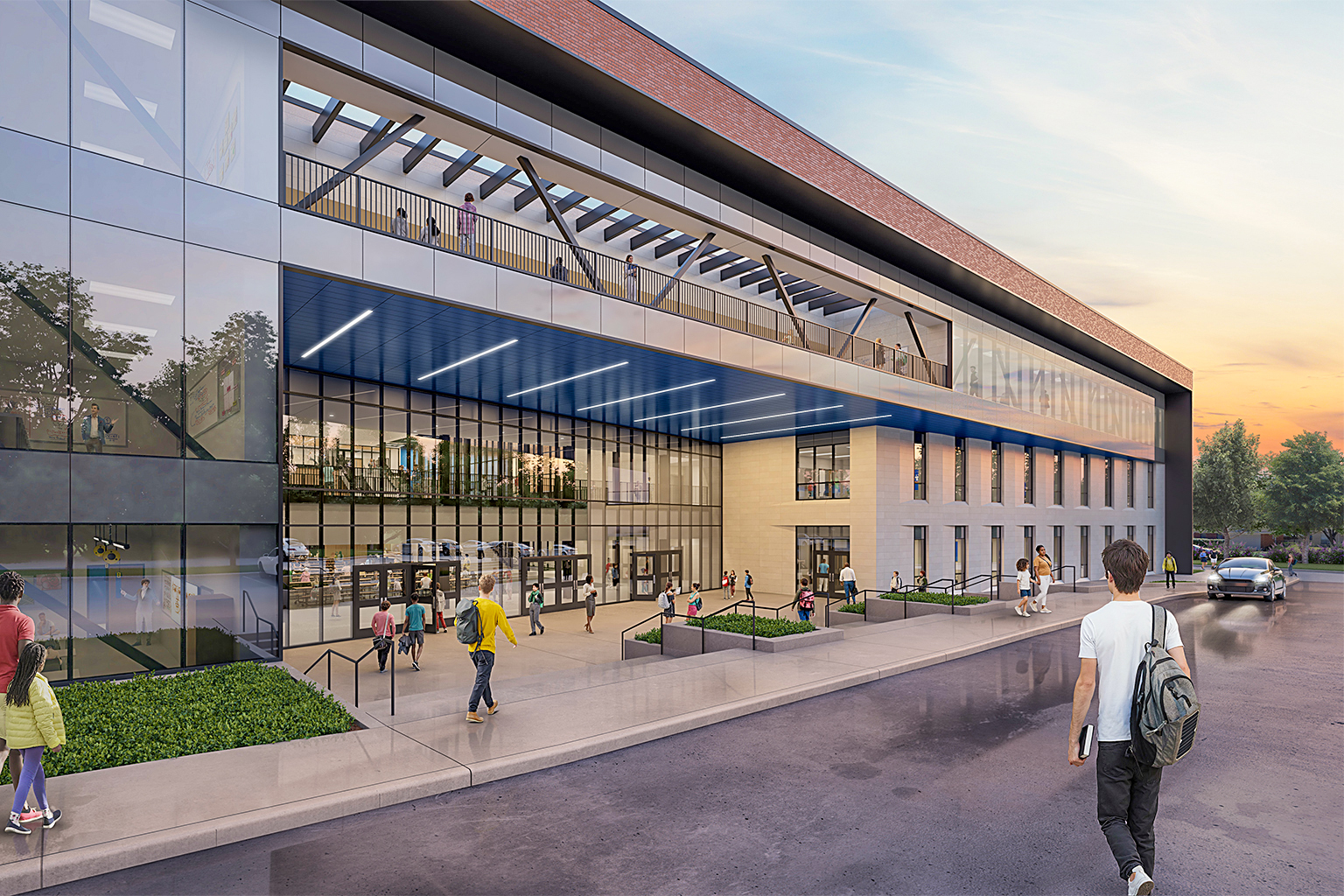 Inside, a combination of exposed steel and warm wood tones creates a modern industrial aesthetic—echoing the school’s magnet identity while complementing neighboring Richardson High School. The color palette preserves the school’s legacy with bold blue accents marking key entry points and interior spaces. Externally, vertical fins and staggered window patterns add rhythm, depth, and a sense of motion to the façade, reflecting the dynamic spirit of the students within.