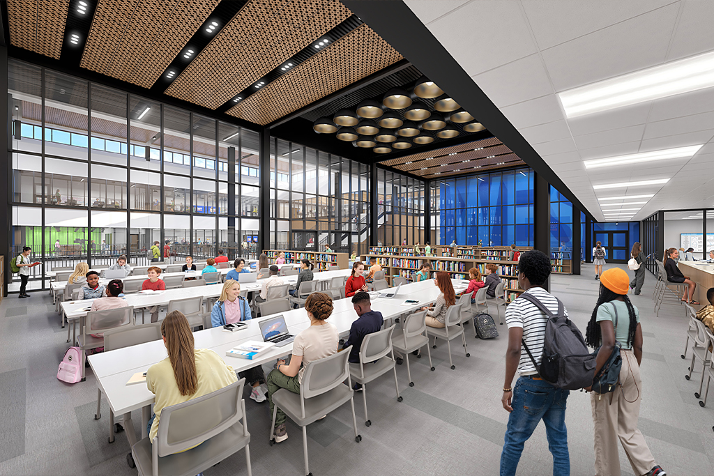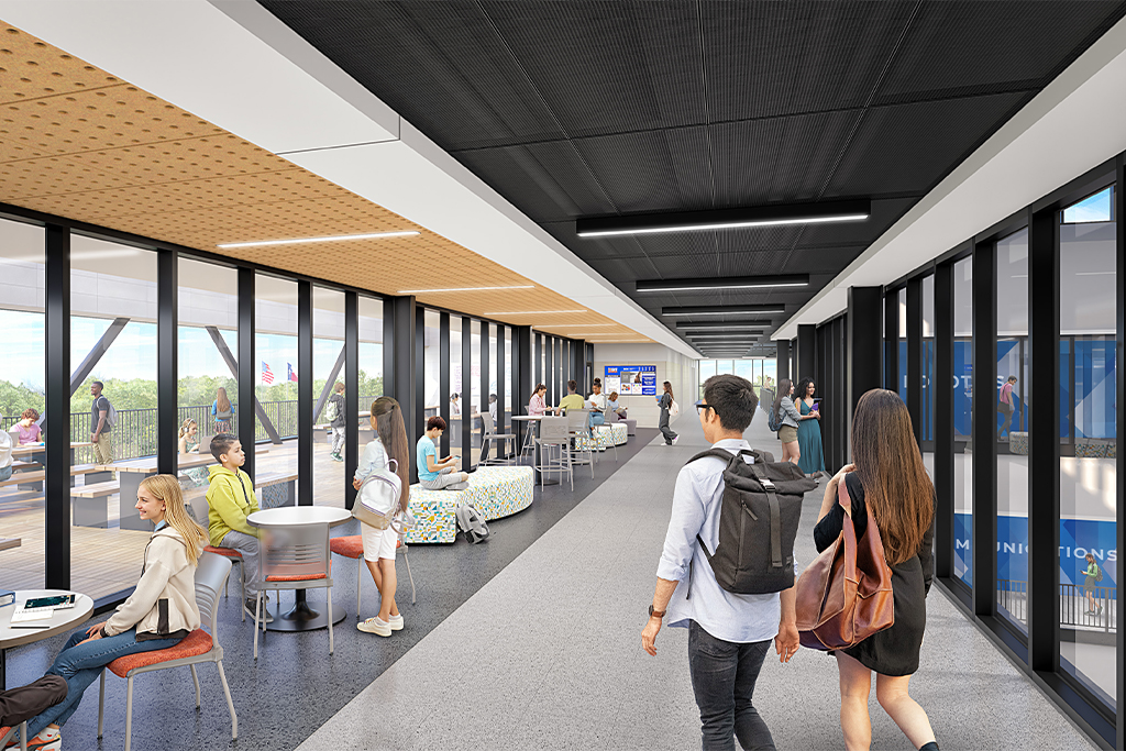 Career and Technical Education (CTE) and Collaboration spaces orbit this central hub, encouraging exploration and discovery. Ground-level CTE and performing arts programs—including culinary arts, a performance stage, and a black box theater—activate the building’s core, showcasing learning in action and celebrating student creativity. Clerestory windows draw daylight deep into the commons, while academic wings wrap the building perimeter to maximize natural light and views. Athletic spaces are positioned along the southern edge for efficient access to existing parking and event circulation. A two-story media center on the second floor and upper-level collaboration areas overlook the central commons, reinforcing vertical connectivity and a sense of community throughout the building. On the third level, outdoor learning terraces provide secure, flexible environments for hands-on learning and reflection.