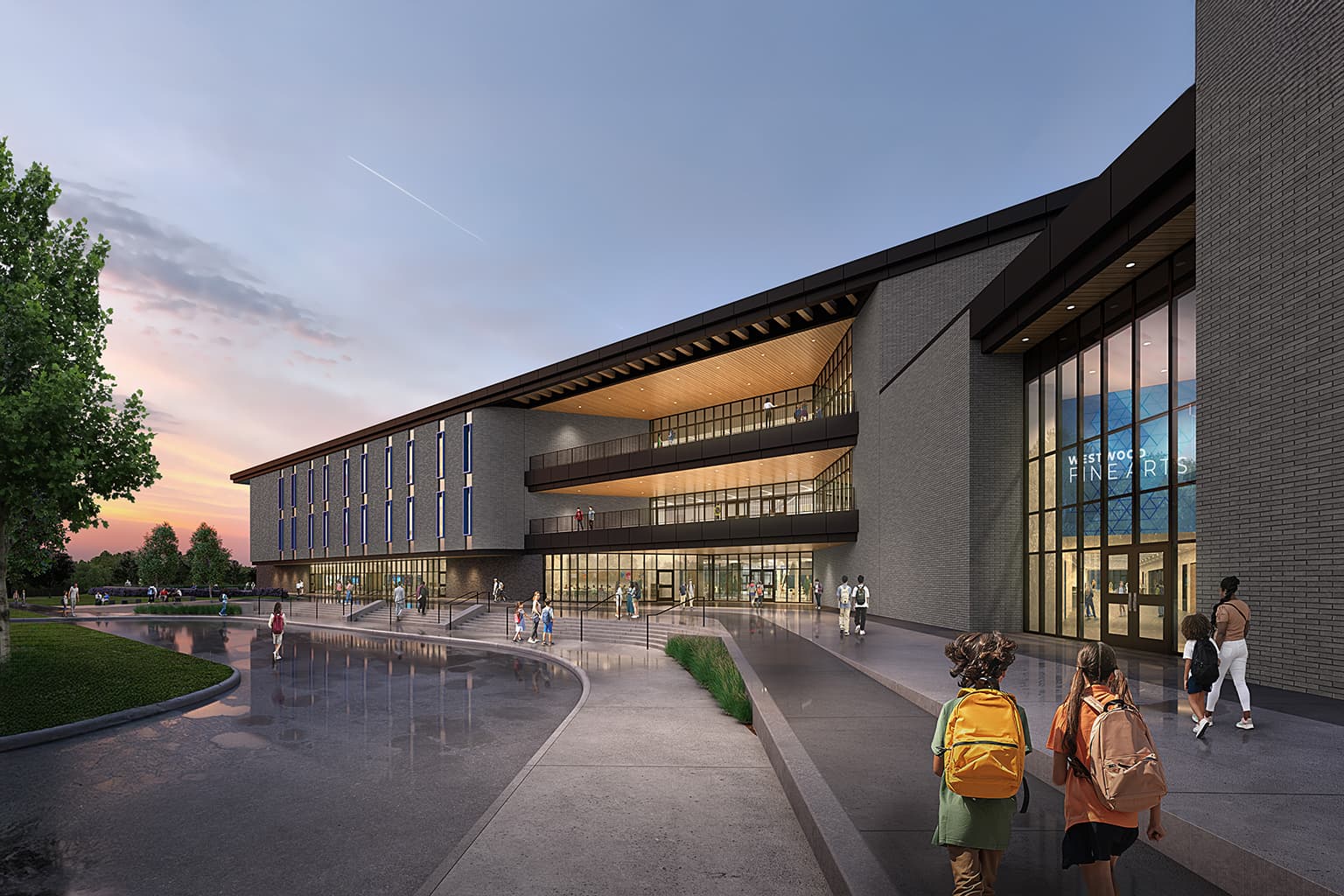 Expansive windows flood interior spaces with natural light, while outdoor learning terraces on the second and third floors extend learning into the open air. Located on the north and south sides, these terraces are connected by a central corridor that provides clear sightlines and views of the surrounding neighborhood. Athletics and performing arts spaces occupy the first floor, with direct access to athletic fields, tennis courts, and outdoor plazas designed for both learning and recreation. The result is a cohesive, community-centered campus that reflects the energy and pride of Westwood’s students—an environment that inspires collaboration, nurtures exploration, and connects learning with the world beyond the classroom.