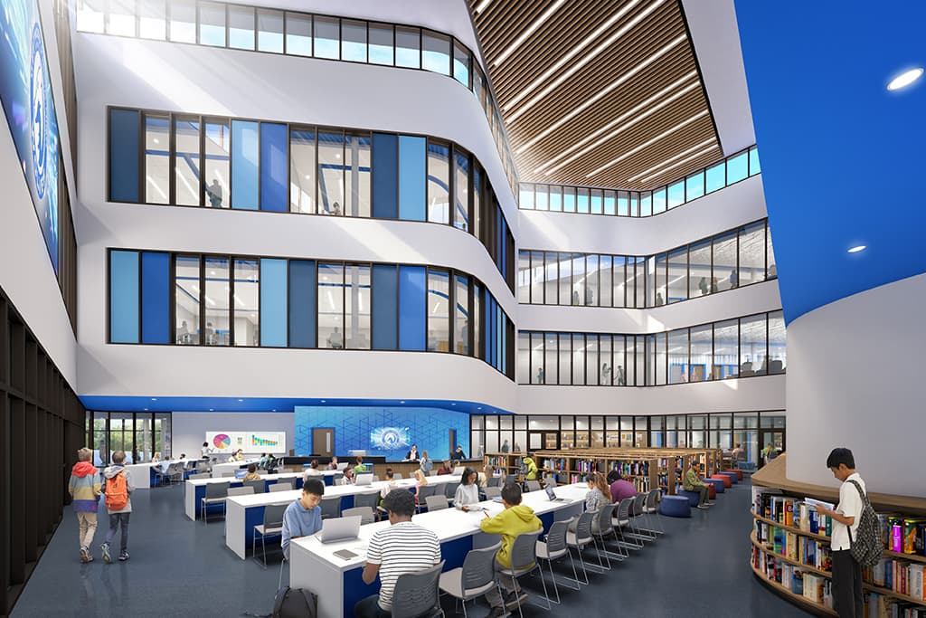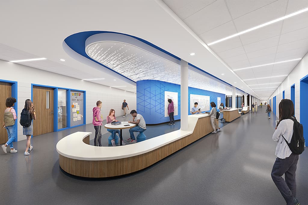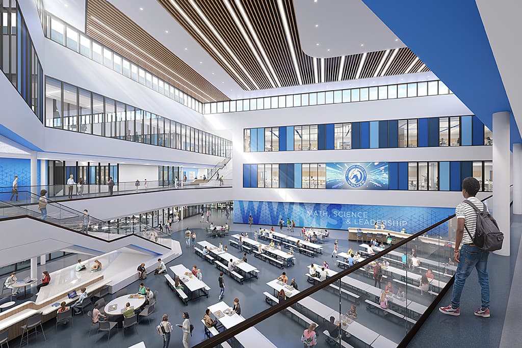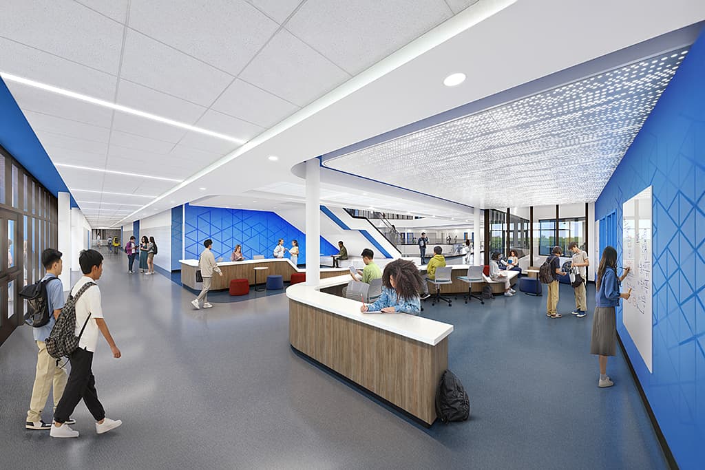 The design emphasizes student engagement, connectivity, and collaboration, fostering a vibrant environment where learning extends beyond the classroom. At the heart of the campus, the cafeteria and media center—inspired by the school’s wolf mascot—serve as dynamic social hubs akin to a “wolf den.” These spaces act as both horizontal and vertical connectors, drawing students together throughout the day and reinforcing a sense of community. From the upper floors, students overlook the central “den,” creating a strong visual and social connection across levels. The school’s colors are woven throughout the interior to enhance wayfinding, celebrate identity, and instill pride and belonging.