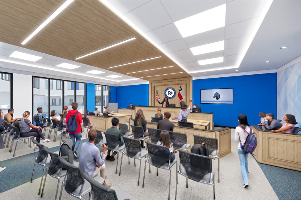 Surrounding the central hub are collaborative zones, CTE labs, and magnet-focused classrooms, while core academic wings are positioned along the perimeter to provide quieter, focused learning environments. The campus features state-of-the-art CTE facilities and specialized magnet programs in leadership, health science, legal and criminal justice, computer science, mathematics, and science, offering students hands-on experiences aligned with real-world career pathways.